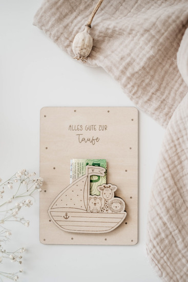 Viele Gäste schenken zur Taufe Geld – sei es als Beitrag für die Zukunft oder für einen besonderen Wunsch. Mit unserer Holzkarte wird aus einem einfachen Geldgeschenk etwas Wertvolles und Kreatives.